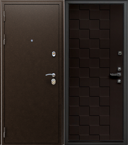 Покрытие: внешняя сторона атмосферостойкое порошково-полимерное покрытие, цвет «антик медь», внутренняя сторона — фрезерованная МДФ панель , толщина 16 мм, цвет — «Эковенге«, «Лиственница бежевая«— Толщина полотна: 120 м